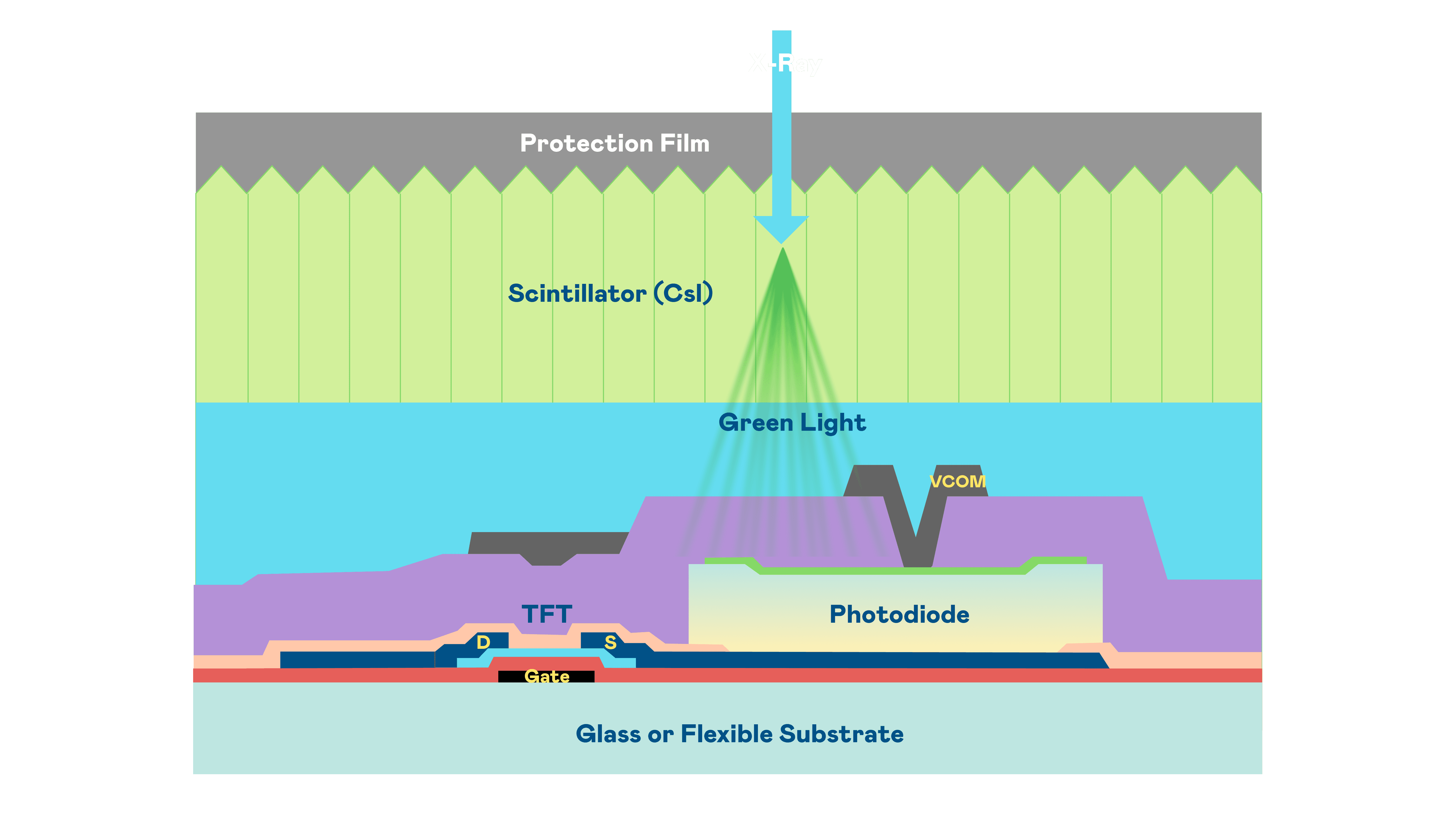 尊龙集团的X光影像感测阵列使用薄膜电晶体 (TFT) 作为每个像素的读取开关,,,,搭配光电二极体(Photodiode)的光电转换元件,,,,用以感测X光影像讯号。。